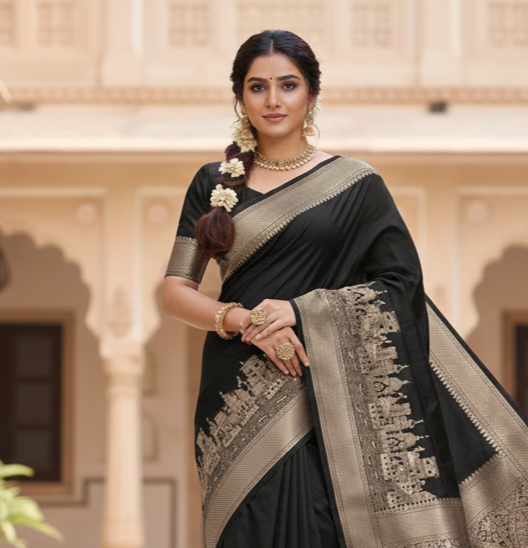 Celebrate the timeless soul of Varanasi with this exquisite Black Banarasi mushru Silk Saree. Crafted for the modern woman who cherishes tradition, this drape features a stunning, intricately woven Golden zari border that pays homage to the iconic Kashi skyline.