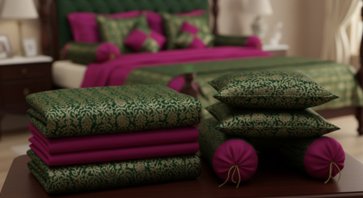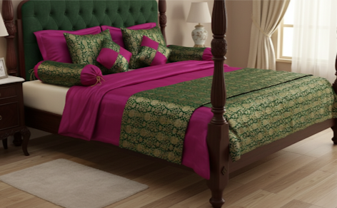 Dark Green & Rani Pink Brocade Banarasi Silk Bedsheet SetDark Green & Rani Pink Brocade Banarasi Silk Bedsheet Set