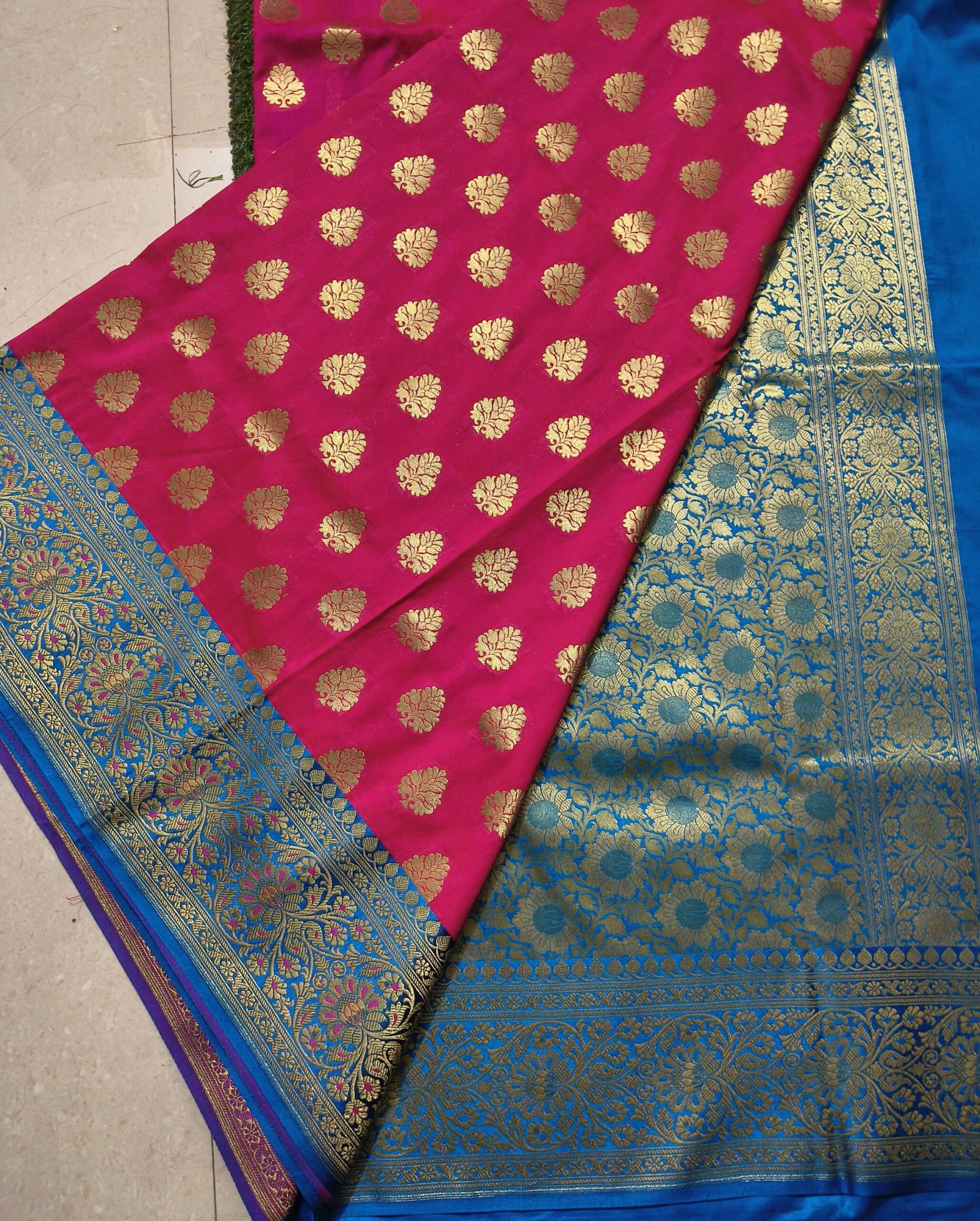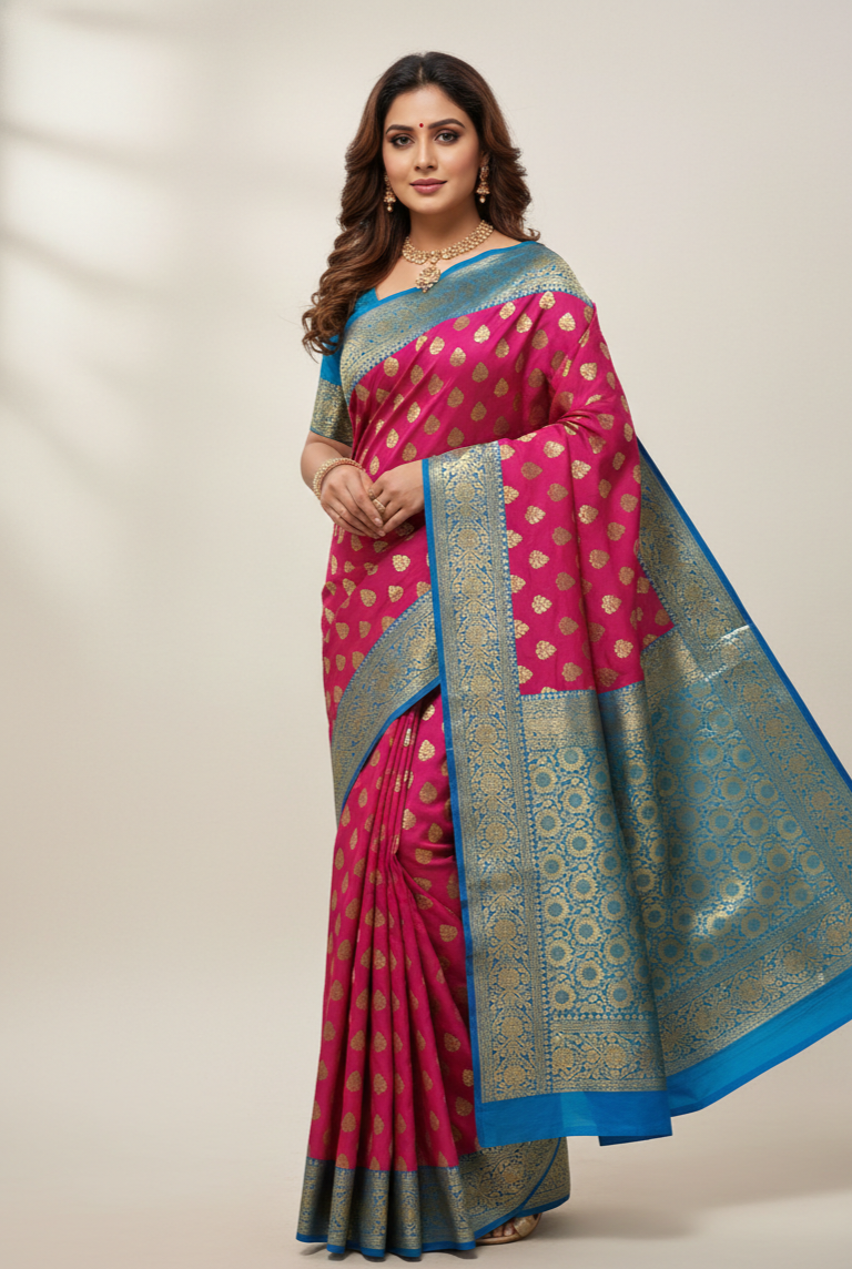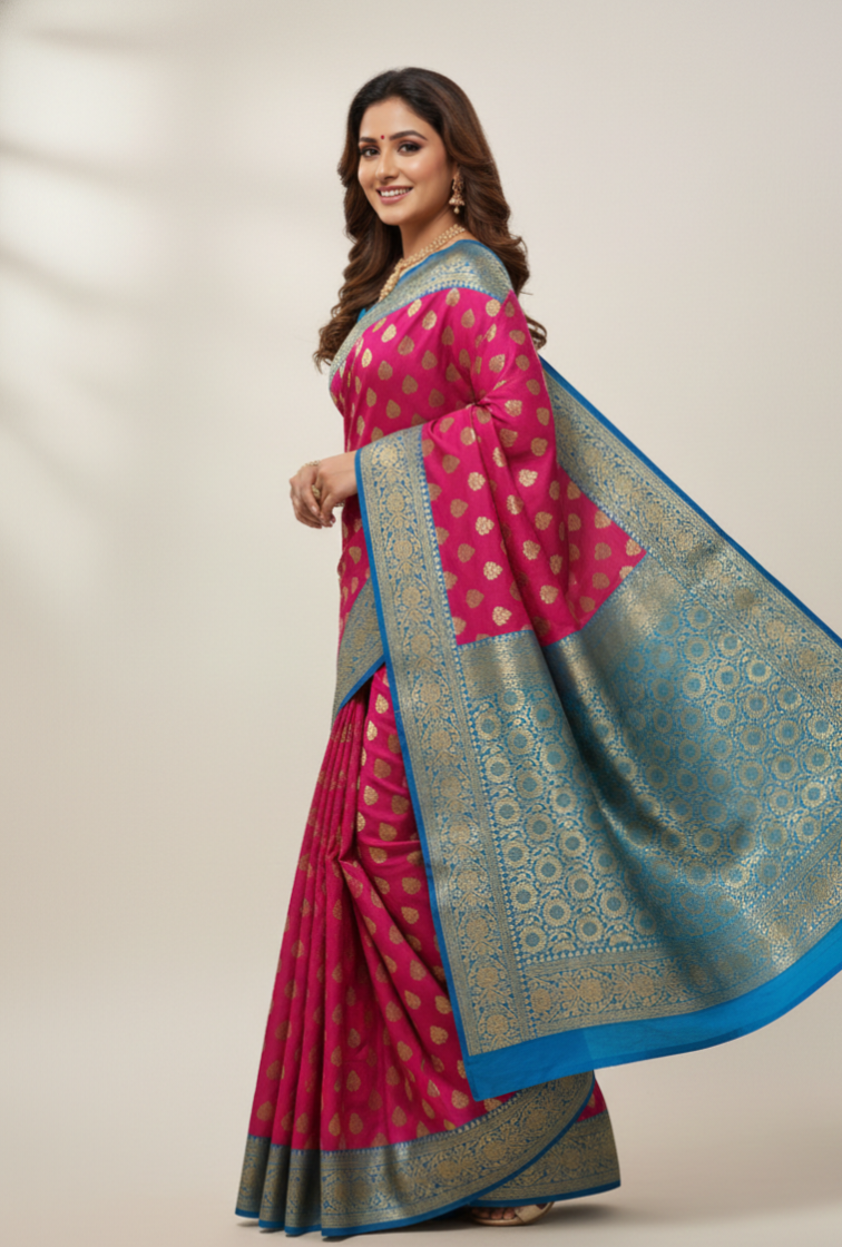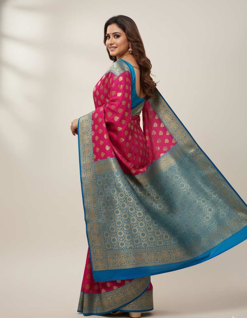 Banarasi Katan Silk Saree: Hot Pink & Blue with Gold Zari Work