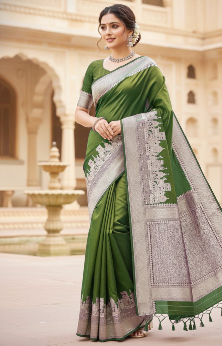 Celebrate the timeless soul of Varanasi with this exquisite Olive green Banarasi Silk Saree. Crafted for the modern woman who cherishes tradition, this drape features a stunning, intricately woven silver zari border that pays homage to the iconic Kashi skyline.