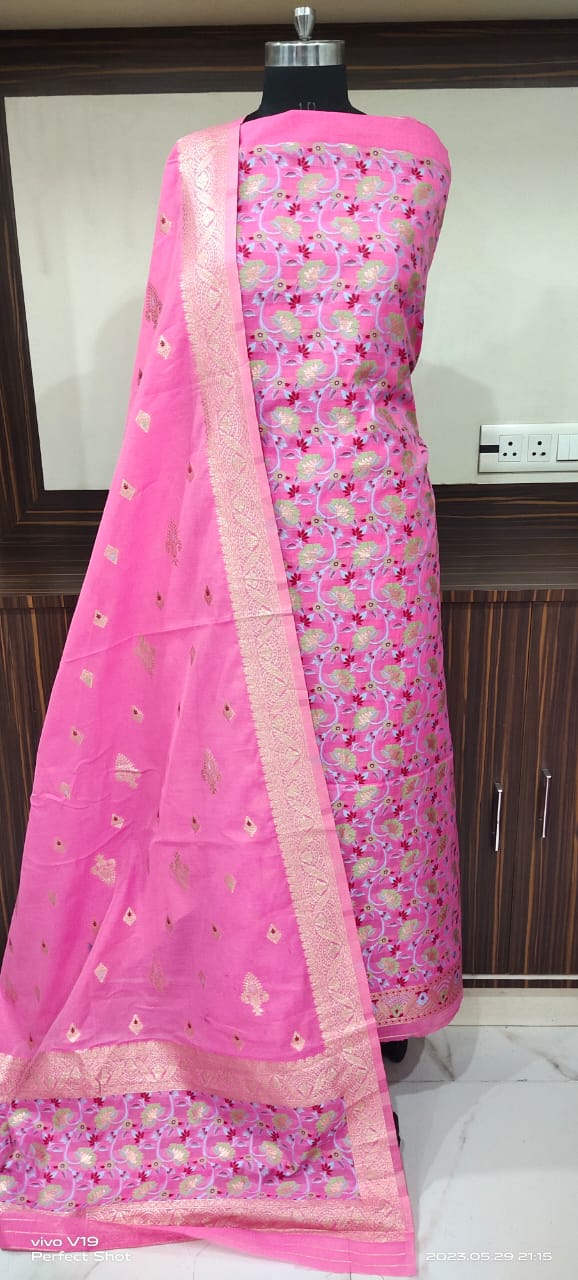 Be the first to review “Premium Pink Banarasi Silk Unstitched Suit Set with Floral Jaal Work & Zari Border Dupatta” Cancel reply