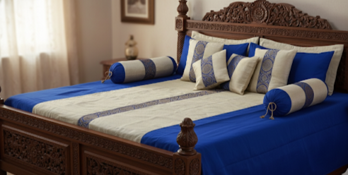 Elevate your bedroom decor with the timeless elegance of our Brocade Banarasi Silk Bedsheet Set. Crafted with intricate weaving and a rich heritage, this set brings the royal charm of Varanasi directly to your home.