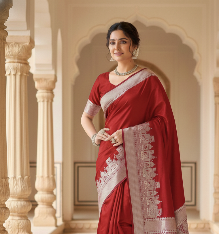 Celebrate the timeless soul of Varanasi with this exquisite Red Banarasi Mushru Silk Saree. Crafted for the modern woman who cherishes tradition, this drape features a stunning, intricately woven silver zari border that pays homage to the iconic Kashi skyline.