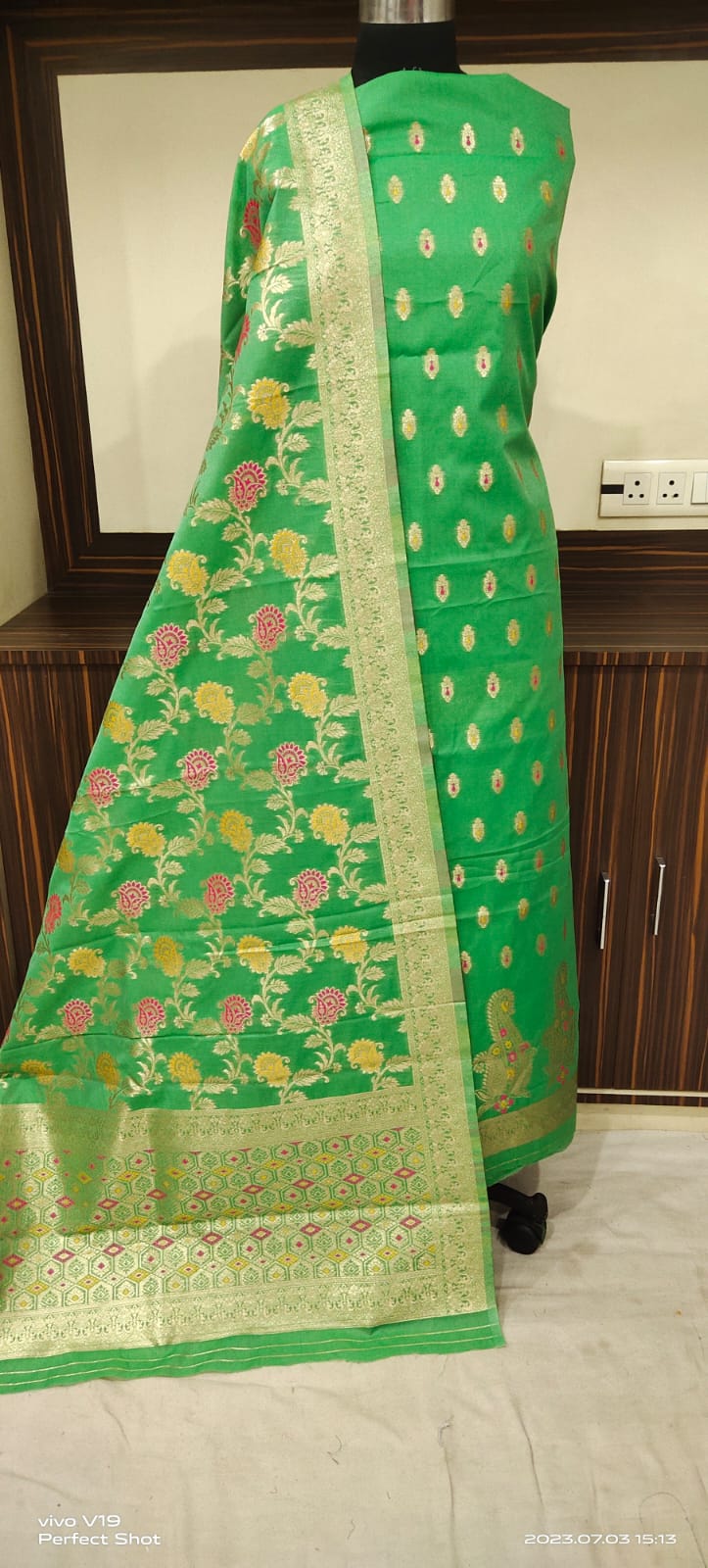 Color– . Rich Emerald Green with Gold Zari