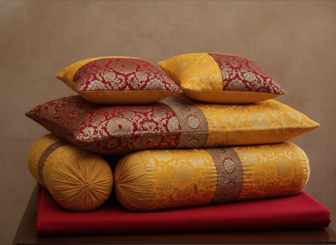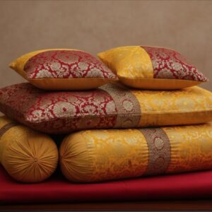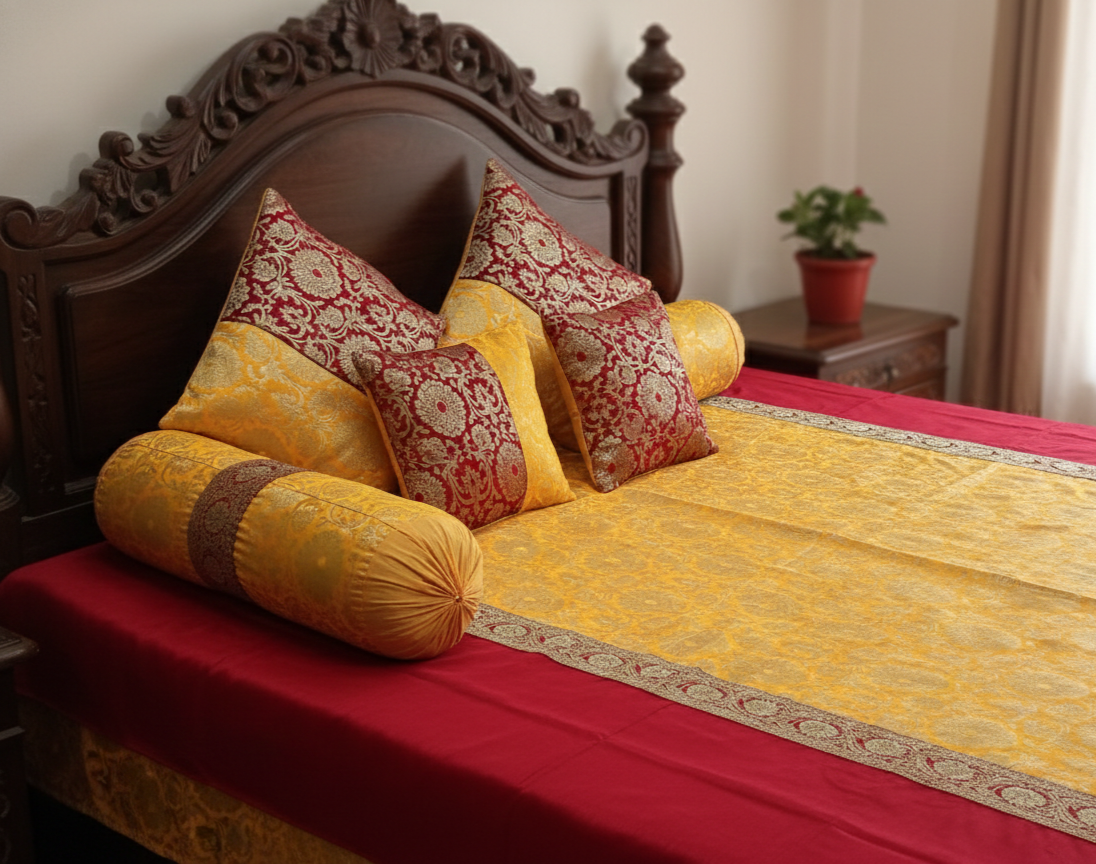 Elevate your bedroom decor with the timeless elegance of our Brocade Banarasi Silk Bedsheet Set. Crafted with intricate weaving and a rich heritage, this set brings the royal charm of Varanasi directly to your home.